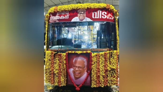 തിരുവനന്തപുരം: മുൻ മുഖ്യമന്ത്രി വി.എസ്. അച്യുതാനന്ദന്റെ ഭൗതികശരീരം വഹിച്ചുകൊണ്ടുള്ള വിലാപയാത്ര കെഎസ്ആർടിസിയുടെ പ്രത്യേക ബസിൽ.സാധാരണ കെഎസ്ആർടിസി ബസിൽ നിന്നും വ്യത്യസ്തമായി ഗ്ലാസ് പാർട്ടീഷൻ ഉള്ള ജെ എൻ 363 എ.സി. ലോ ഫ്ലോർ ബസാണ് (KL 15 A 407) വി.എസ് അച്യുതാനന്ദന്റെ അന്ത്യയാത്രക്കായി തിരഞ്ഞെടുത്തിരിക്കുന്നത്. വി എസിന്റെ ചിത്രങ്ങൾ ഉൾപ്പെടുത്തി പുഷ്പങ്ങളാൽ അലങ്കരിച്ച വാഹനമാണ് ഒരുക്കിയിരിക്കുന്നത്.