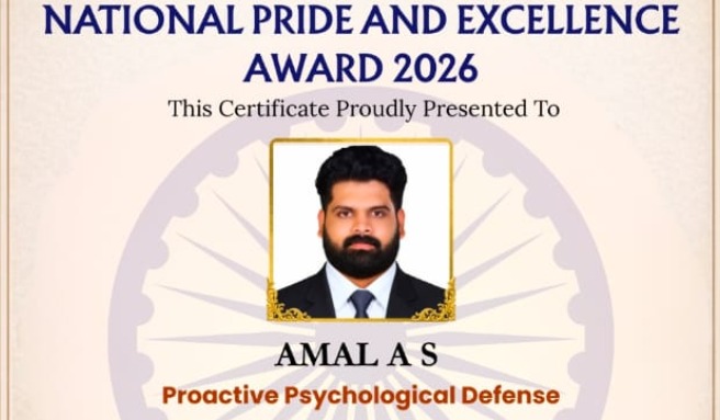 തിരുവനന്തപുരം : രാജ്യത്തിന്റെ റിപ്പബ്ലിക് ദിനത്തോടനുബന്ധിച്ച് നൽകുന്ന ‘നാഷണൽ പ്രൈഡ് ആൻഡ് എക്സലൻസ് അവാർഡ് 2026’ന് തിരുവനന്തപുരം സ്വദേശി അമൽ എ.എസ് അർഹനായി. ഡൽഹി ആസ്ഥാനമായി പ്രവർത്തിക്കുന്ന ത്രേതായുഗ് ഫൗണ്ടേഷനാണ് ഈ പുരസ്കാരം നൽകി ആദരിച്ചത്. തിരുവനന്തപുരം പോത്തൻകോട് സ്വദേശികളായ സന്ധ്യയുടെയും അനിലിന്റെയും മകനായ അമൽ, ‘പ്രോആക്റ്റീവ് സൈക്കോളജിക്കൽ ഡിഫൻസ്’ എന്ന മേഖലയിൽ നൽകിയ മികച്ച സംഭാവനകൾ പരിഗണിച്ചാണ് ഈ ആദരം.